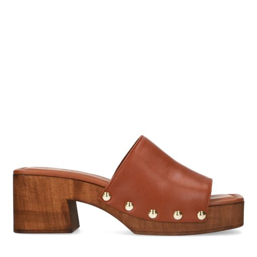 Cognac leren muiltjes met houten hak Damesschoenen – SACHA